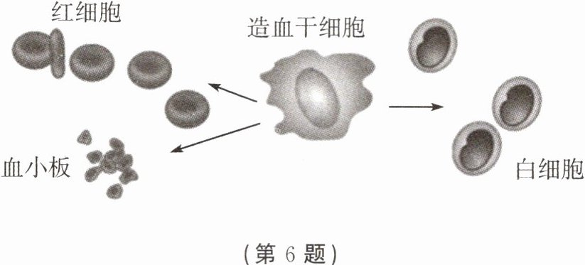 6. 再生障碍性贫血是由于各种原因使骨髓的造血功能发生障碍,造成患者出现一系列的贫血症状。该病可通过骨髓移植进行治疗,这是因为健康人体骨髓中的造血干细胞能产生新的血细胞。造血干细胞产生新的血细胞的过程称为细胞的(