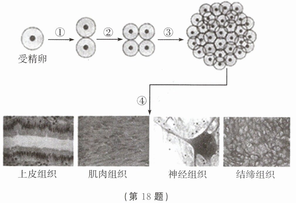 18. 从一个受精卵发育成一个成熟胎儿,婴儿的出生让我们看到了生命的奇妙变化。下图表示人体组织的形成过程,请分析回答问题。
