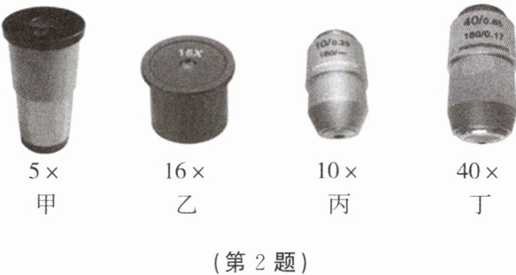 2. 下图是光学显微镜的4个镜头,甲、乙的一端无螺纹,丙、丁的一端有螺纹。若要视野中出现的细胞数目最多,则应该选用的镜头组合是(