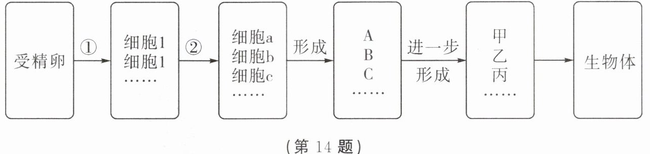 14. (5分)如图是西西绘制的绿色开花植物体和人体结构层次共同部分的示意图,①和②表示细胞生理活动,细胞1、细胞a、细胞b、细胞c表示不同类型的细胞,A、B、C表示不同类型的组织,甲、乙、丙表示不同类型的器官,请据图回答下列问题。
