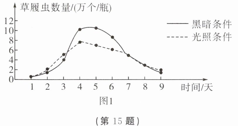 15. (8分)兴趣小组的同学在池塘中采集到草履虫后,查阅资料了解到光照对草履虫数量变化的影响情况如图1所示,请据图回答下列问题。