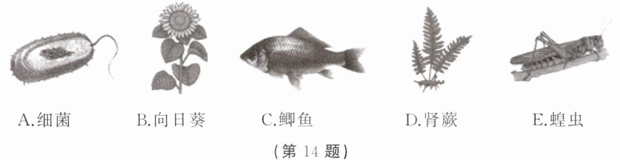 14. 下图为五种生物的形态图,请据图回答下列问题。