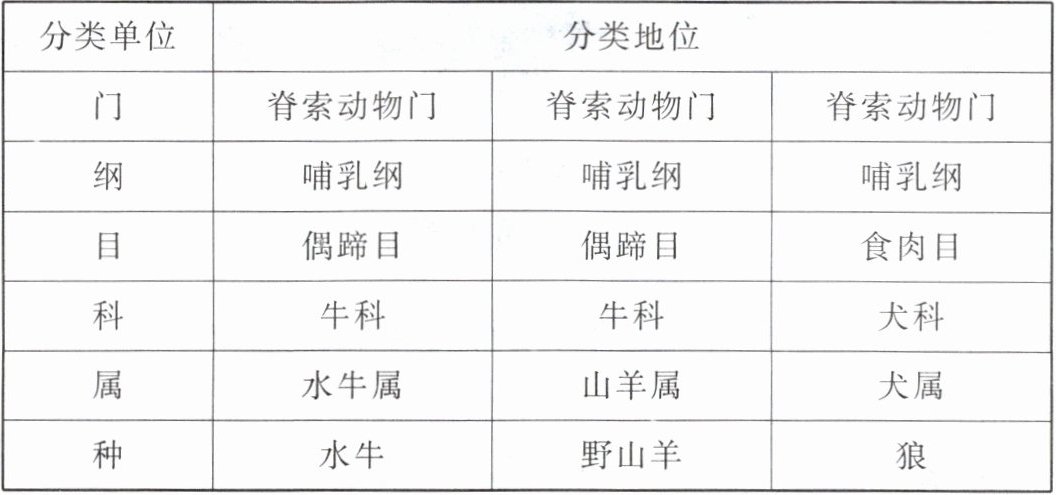 16. 下表表示水牛、野山羊、狼的分类等级,请据表回答下列问题。