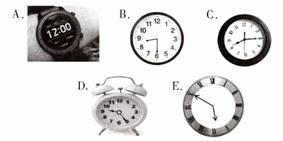 1.C quarter past eight 2.B half past eight 3.A twelve o'clock 4.E ten to six 5.D twenty-five past nine