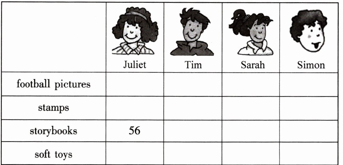 听录音,仿照范例,写出小朋友们收集物品的数量。