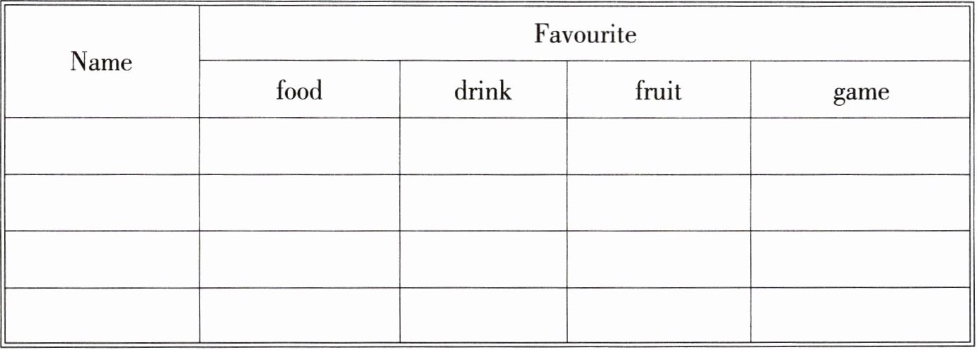 这道题目是考查英语对话编写以及根据喜好完成表格的能力,属于英语五年级的常见题型。首先需要根据自己和好朋友的喜好完成表格,然后根据表格内容和给定句式编写对话。完成表格时需要明确每个人最喜欢的食物、饮料、水果和游戏;编写对话时要运用给定的句式,将表格中的信息融入进去。