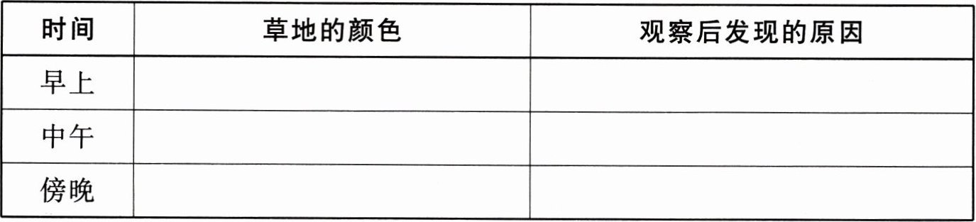 1.时间 草地的颜色 观察后发现的原因 早上 绿色 蒲公英花朵合拢了 中午 金色 蒲公英花朵张开了 傍晚 绿色 蒲公英花朵合拢了 2.(提示:围绕留心观察事物的变化谈启发。)