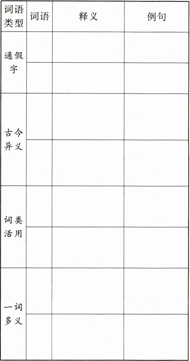 1. 根据下面的表格,梳理本单元重点文言词语。(每类至少梳理2个)