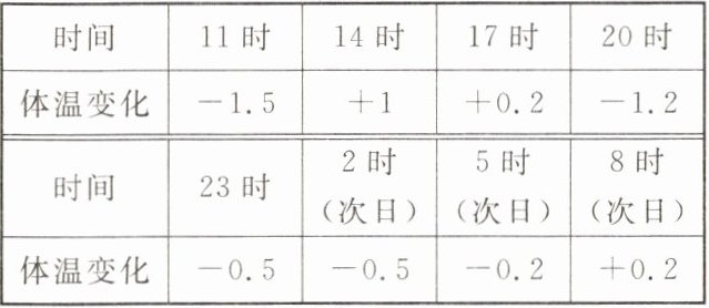 7. 一名病人早晨8时的体温是39.7℃,下表是该病人24小时的体温变化(用正数记录体温比前一时刻的上升数,用负数记录体温比前一时刻的下降数).