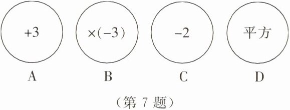 7. 数学课上,老师用 A,B,C,D 四张圆形卡片分别代表一种运算,并依据这四张圆形卡片设计了数学游戏,学生可以将卡片 A,B,C,D 重新排序,进行一次列式计算. 例如,若按 A→B→C→D 的顺序进行运算,则可列算式为$[(+3)×(-3)-2]^{2}$. 当卡片 B 或 D 排在第一张时,可以选择任意一个有理数进行卡片 B 或 D 的运算,然后再将剩余卡片继续运算. 例如,若选择 4,并按 D→A→B→C 的顺序进行运算,则可列算式为$(4^{2}+3)×(-3)-2$.