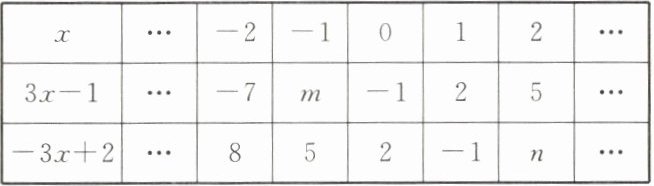 (1) 当 $x=-1$ 时,$3x - 1 = 3×(-1)-1=-4$,所以 $m=-4$;当 $x=2$ 时,$-3x + 2=-3×2 + 2=-4$,所以 $n=-4$。