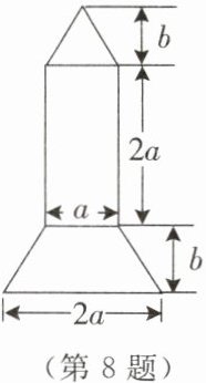 (1) 解:由题意得,三角形面积为$\frac{1}{2}ab$,长方形面积为$a\cdot 2a=2a^2$,梯形面积为$\frac{1}{2}(a + 2a)b=\frac{3}{2}ab$。则截面面积$S=\frac{1}{2}ab + 2a^2+\frac{3}{2}ab=2a^2 + 2ab$。