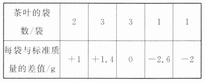 差值为+1、+1.4、0、-2的茶叶均在误差范围内,对应的袋数为2+3+3+1=9袋;差值为-2.6的茶叶超出误差范围,袋数为1袋。