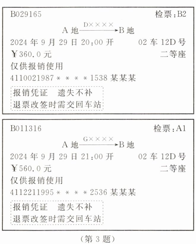 3. 以下是两张不同类型的火车票示意图(“D××××次”表示动车,“G××××次”表示高铁):