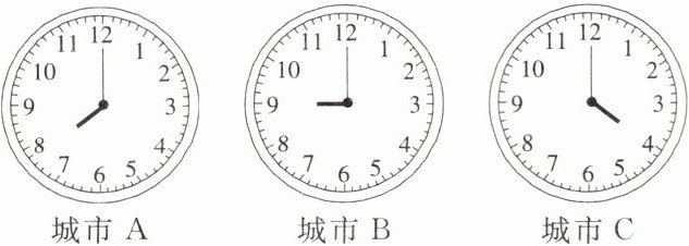 再由图可知,五个时钟显示的时间中,城市$C$与城市$E$的时间相差$2$小时,城市$C$与城市$A$的时间相差$13$小时,城市$C$与城市$D$的时间相差$7$小时,城市$C$与城市$B$的时间相差$8$小时。