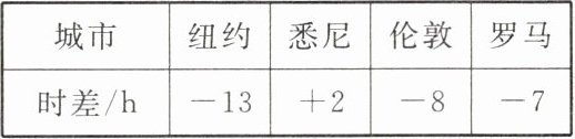 由表可知,同一时刻,悉尼的时间比北京时间早$2$小时,纽约的时间比北京时间晚$13$小时,伦敦的时间比北京时间晚$8$小时,罗马的时间比北京时间晚$7$小时。