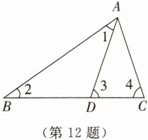 12. 如图所示,在△ABC中,D为BC边上的一点,∠1= ∠2,∠3= ∠4,∠BAC= 72°.求∠DAC的大小.