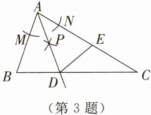 3. 如图所示,在△ABC 中,AB= 6,AC= 9,BC= 11. 若根据图中的作图痕迹作射线 AP,交 BC 于点 D,点 E 在 AC 边上,AE= AB,连接 DE,则△CDE 的周长为______.