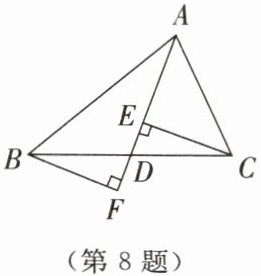 8. 如图所示,在$\triangle ABC$中,$AD$是中线,$CE\perp AD于点E$,$BF\perp AD交AD的延长线于点F$. 求证$BF= CE$.
