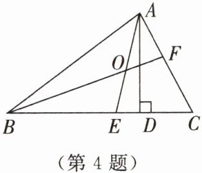 4. 如图所示,AD,AE分别是△ABC的高和角平分线,BF是∠ABC的平分线,BF与AE交于点O.若∠ABC= 40°,∠C= 60°,求∠DAE,∠BOE的大小.