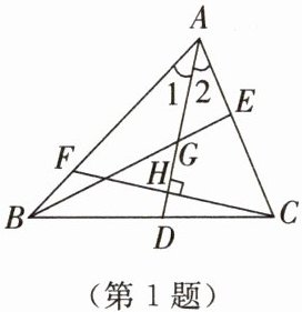 1. 如图所示,在△ABC中,∠1= ∠2,G为AD的中点,延长BG交AC于点E,F为AB上一点,CF⊥AD于点H.下列判断正确的有