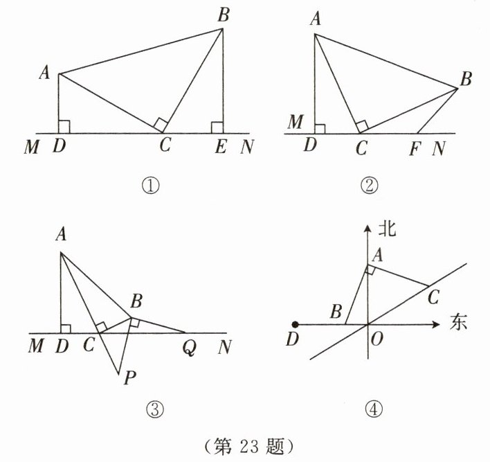 (2)如图③所示,在$Rt\triangle ABC$中,$\angle ACB= 90°$,$AD\perp MN于点D$,点$Q在直线MN$上,$CQ= AC$,点$P在AC$的延长线上,$BP= BQ$,且$BP\perp BQ$.若$AD= 5$,$CP= 3$,求$\triangle CQB$的面积.