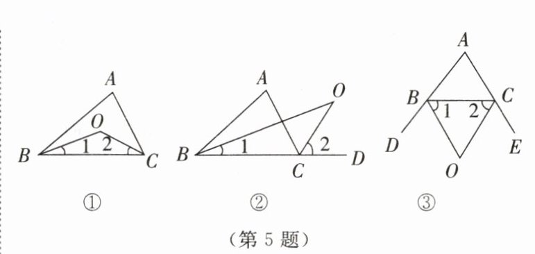 5. (1)如图①所示,在$\triangle ABC$中,$\angle ABC和\angle ACB$的平分线交于点O,求证$\angle BOC= 90^\circ+\frac{1}{2}\angle A;$