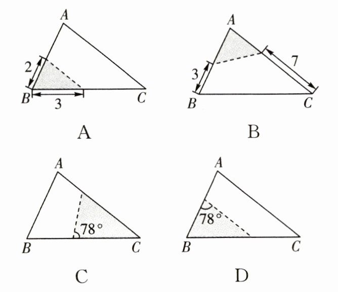 D图中,剪下的三角形与原三角形有两个角相等(一个是$\angle A=78^\circ$,另一个是原三角形的另一个角,因为剪下的三角形的一个角与原三角形的对应角相等,且它们有一个公共角$\angle A$的补角),所以这两个三角形相似,不符合题意。