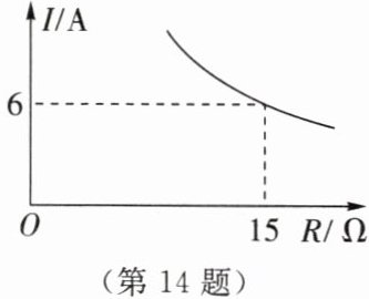 14. 已知蓄电池的电压为定值,使用蓄电池时,电流$I$(单位:A)与电阻$R$(单位:$\Omega$)成反比例函数关系,某个蓄电池工作时的图象如图所示。