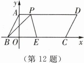 12. 如图所示,在平面直角坐标系中,$O$为坐标原点,四边形$ABCD$是平行四边形,点$A$,$B$,$C的坐标分别为A(0,4)$,$B(-2,0)$,$C(8,0)$,$E是BC$的中点,$P为线段AD$上的动点。若$\triangle BEP是以BE$为腰的等腰三角形,则点$P$的坐标为______。