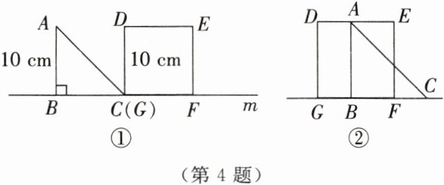 4. 如图所示,等腰直角三角形 $ ABC $ 以 2 cm/s 的速度沿直线 $ m $ 匀速向正方形 $ DEFG $ 移动,直到 $ AB $ 与 $ EF $ 重合.设移动 $ x $ s 时,三角形与正方形重合部分的面积为 $ y \, cm^2 $.