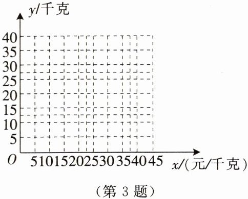 3. 某超市销售一种进价为 18 元/千克的商品,经市场调查后发现,每天的销售量 $ y $(千克)与销售单价 $ x $(元/千克)有如下表所示的关系: