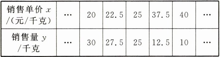 | 销售单价 $ x $/(元/千克) | ... | 20 | 22.5 | 25 | 37.5 | 40 | ... |