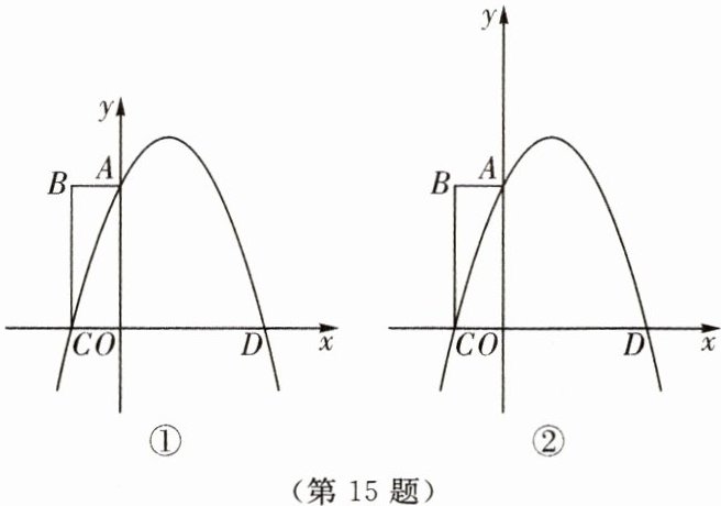 15. 如图所示,在平面直角坐标系中,矩形OABC的顶点C和A分别在x轴和y轴上,经过A,C两点的抛物线交x轴于另一点D. 请仅用无刻度的直尺完成以下作图(保留作图痕迹).