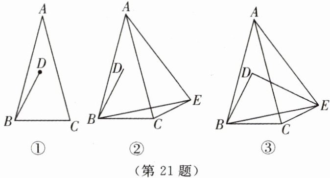 21. 如图所示,在$\triangle ABC$中,$AB= AC$,$\angle BAC= \alpha(0^{\circ}<\alpha<60^{\circ})$,将线段BC绕点B逆时针旋转60°得到线段BD.