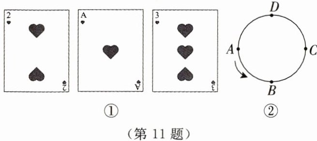 11. 有三张扑克牌,点数如图①所示,将它们洗匀后背面朝上放在桌上. A,B,C,D是圆的四等分点,如图②所示. 现通过抽取扑克牌的办法玩跑圈游戏,规则如下:若抽取扑克牌的牌面上的数字是n,就从图②中点A的位置沿圆弧逆时针方向连续跑过n个$\frac{1}{4}$圆,第二次跑圈以第一次跑圈结束后的位置为起点,按照规则继续进行.