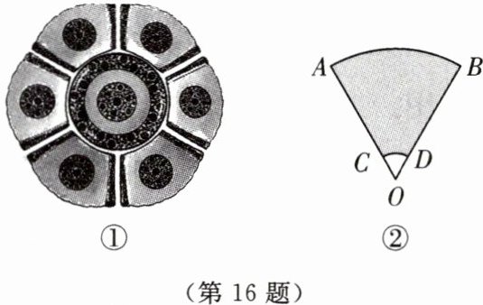 16.中国美食讲究色香味俱全,优雅的摆盘造型也会让美食锦上添花.图①中的盘子由六个造型相同的图案构成,其形状包含扇形的一部分,图②是其部分几何示意图(阴影部分为盘子盛菜区域).若$AC = BD = 12\ cm$,$OC = OD = \frac{1}{5}OA$,请你根据上述信息求图②中阴影部分的面积.