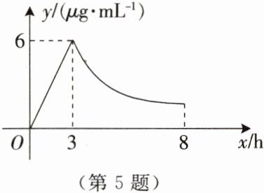 5. 某药品研究所研发了一种抗击流感病毒的新药,经大量动物实验,首次用于临床人体实验,测得成人服用该药后血液中的药物浓度 $ y(\mug/mL) $ 与服药后时间 $ x(h) $ 之间的函数关系如图所示. 当血液中药物浓度上升($ 0 \leq x \leq a $)时,满足 $ y= 2x $,下降时,$ y $ 与 $ x $ 成反比.