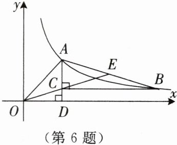6. 如图所示,在 $ Rt\triangle ABC $ 中,$ \angle ACB= 90^\circ $,顶点 $ A,B $ 都在反比例函数 $ y= \frac{k}{x}(x>0) $ 的图象上,直线 $ AC \perp x $ 轴,垂足为 $ D $,连接 $ OA,OC $,并延长 $ OC $ 交 $ AB $ 于点 $ E $. 当 $ AB= 2OA $ 时,$ E $ 恰为 $ AB $ 的中点. 若 $ \angle AOD= 45^\circ $,$ OA= 2\sqrt{2} $.