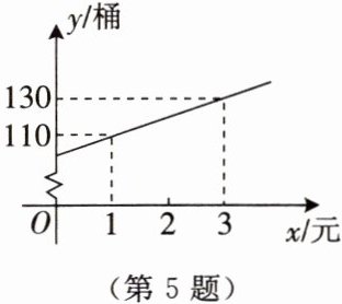 5. 某药店新进一批桶装消毒液,每桶进价 35 元,原计划以每桶 55 元的价格销售,现决定降价销售. 已知这种消毒液销售量y(桶)与每桶降价x(元)($0<x<20$)之间满足一次函数关系,其图象如图所示.