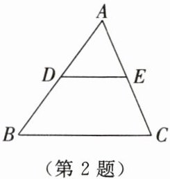 2. 如图所示,$D,E分别为\triangle ABC的边AB,AC$上的中点。若$\triangle ADE的面积为\frac{1}{2}$,则四边形$DBCE$的面积为