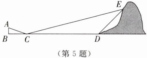 5. 如图所示,小华和同伴秋游时,发现在某地小山坡的点$E$处有一棵小树,他们想利用皮尺、测倾器和平面镜测量小树到山脚下的距离(即$DE$的长)。小华站在点$B$处,让同伴移动平面镜至点$C$处,此时小华在平面镜内可以看到点$E$,且测得$BC= 6\ m$,$CD= 22\ m$,$\angle CDE= 135^\circ$($B,C,D$在同一直线上)。已知小华的眼睛距离地面的高度$AB为1.6\ m$。请根据以上数据,求$DE$的长(结果保留根号)。