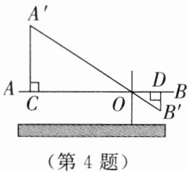 4. 如图所示,已知某停车场入口处的栏杆的长臂$AO是12\ m$,短臂$BO是1.1\ m$。当长臂端点垂直升高$A'C为9\ m$时,短臂端点垂直下降了多少米(栏杆宽度忽略不计)?