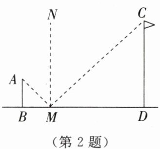 2. 如图所示,小明想要利用平面镜来测量学校旗杆$CD$的高。他将镜子放置在距离旗杆底部$D点16\ m的点M$处,然后沿$DM方向后退直到从镜子中正好看到旗杆顶端C$点,此时测量镜子和小明之间的距离$BM长为2\ m$。若小明的眼睛距离地面的高度$AB是1.6\ m$,则旗杆$CD$的高为______$m$。