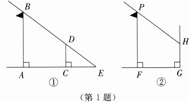 1. 为了测得图①和图②中旗杆的高度,在太阳光下同一时刻,小明和小红分别测得竹竿$CD长0.9\ m$,其影长$CE为1\ m$。