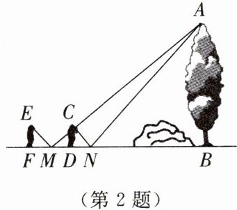2. 小颖想利用镜子与皮尺测量大树$AB$的高,因大树底部有障碍物,无法直接测量到大树底部的距离,于是她设计出下列测量方案:小颖站在点$F$处,将镜子放在点$M$处时,刚好看到大树的顶端,沿大树方向向前走$3\ m$,到达点$D$处,将镜子放在点$N$处时,刚好看到大树的顶端(点$F,M,D,N,B$在同一条直线上)。测得$FM= 1.5\ m$,$DN= 1\ m$,小颖眼睛到地面的距离为$1.6\ m$,如图所示。