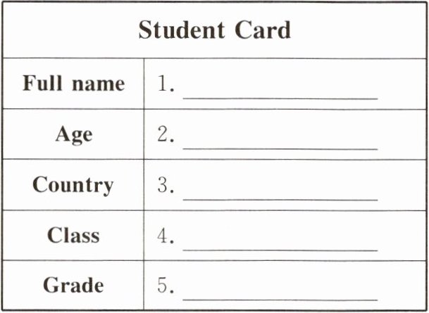 【答案】:由于缺少独白内容,无法给出具体答案。在实际考试中,你需要根据听到的独白内容,将相关信息填写到学生信息卡的空白处。例如,如果独白中提到Paul的全名是Paul Brown,年龄是12岁,来自Canada,他在Class 2, Grade 7,那么学生信息卡应该填写如下: