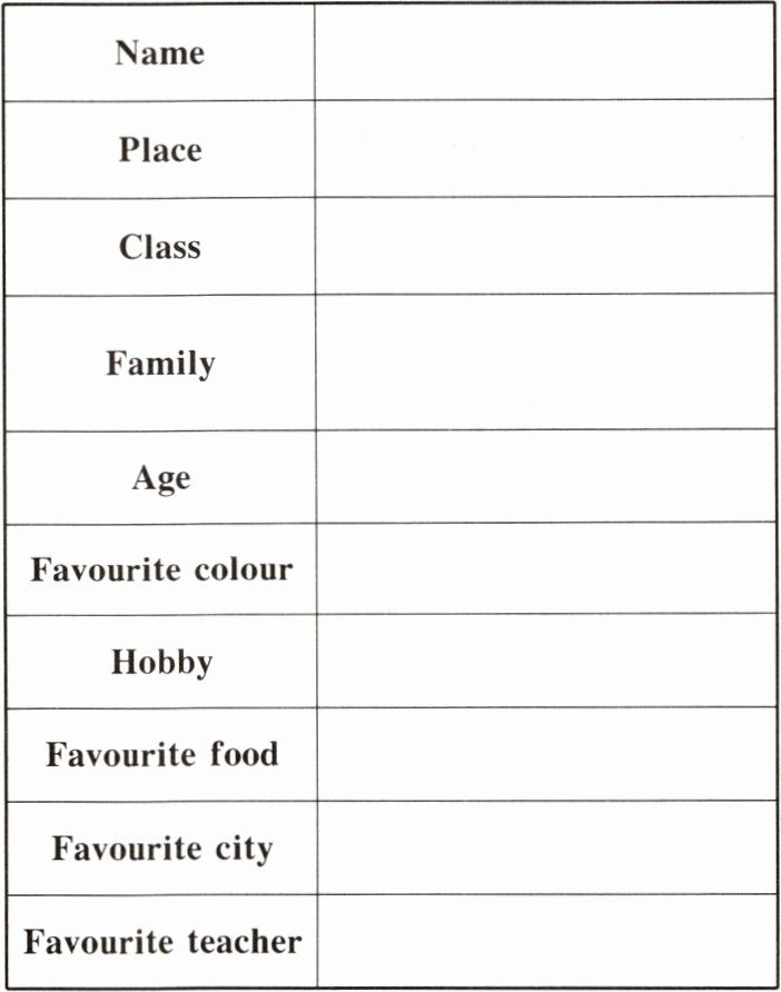 这是一道英语信息采集与填表题,考查学生对个人情况相关英语词汇和表达的理解与运用能力,以及从给定信息中提取关键内容并准确填入表格的能力。解题关键在于熟悉各项个人情况对应的英语词汇,如“Name”(名字)、“Place”(地点)、“Class”(班级)等,然后根据题目要求,将新朋友的相关信息准确填入对应表格位置。由于题目未给出具体新朋友信息及插图内容,假设我们有如下新朋友信息:名字是Tom,来自New York,在Class 1,家庭有三口人,年龄13岁,最喜欢的颜色是blue,爱好是reading,最喜欢的食物是pizza,最喜欢的城市是Paris,最喜欢的老师是Mr. Wang。