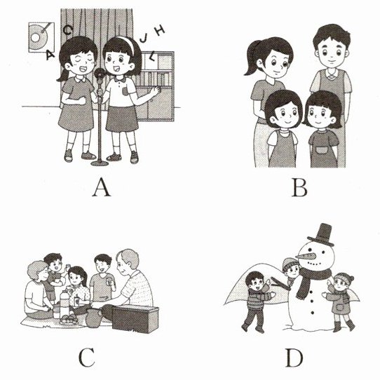 3. 第三段文字介绍提到“The girl is my sister,Lin Yue. She is a quiet girl,and I'm shy. But we both like singing English songs.”,意思是这个女孩是作者的妹妹林悦,她很安静,作者很害羞,但她们都喜欢唱英文歌。A图中有两个女孩在唱歌,符合描述,所以3对应A。