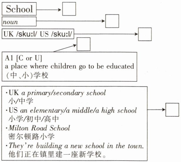 第四个方框填C(例子(用)),因为“UK a primary/secondary school”等是对“School”的举例说明。